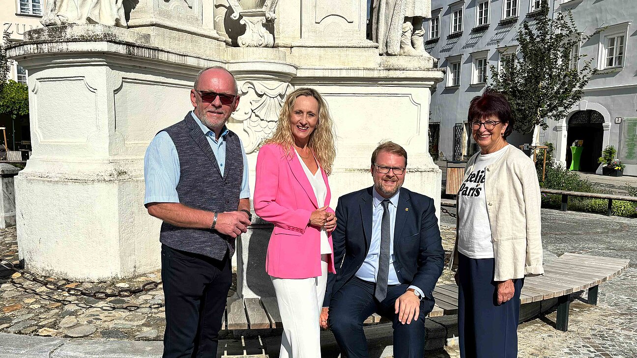 Bild 1: Josef Edlinger, GR Drin Eva Maria Hochstöger, Vbgm. Dr. Florian Kamleitner und GR Christa Eberl beim Lokalaugenschein am Dreifaltigkeitsplatz.