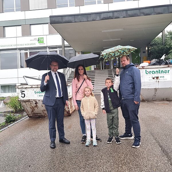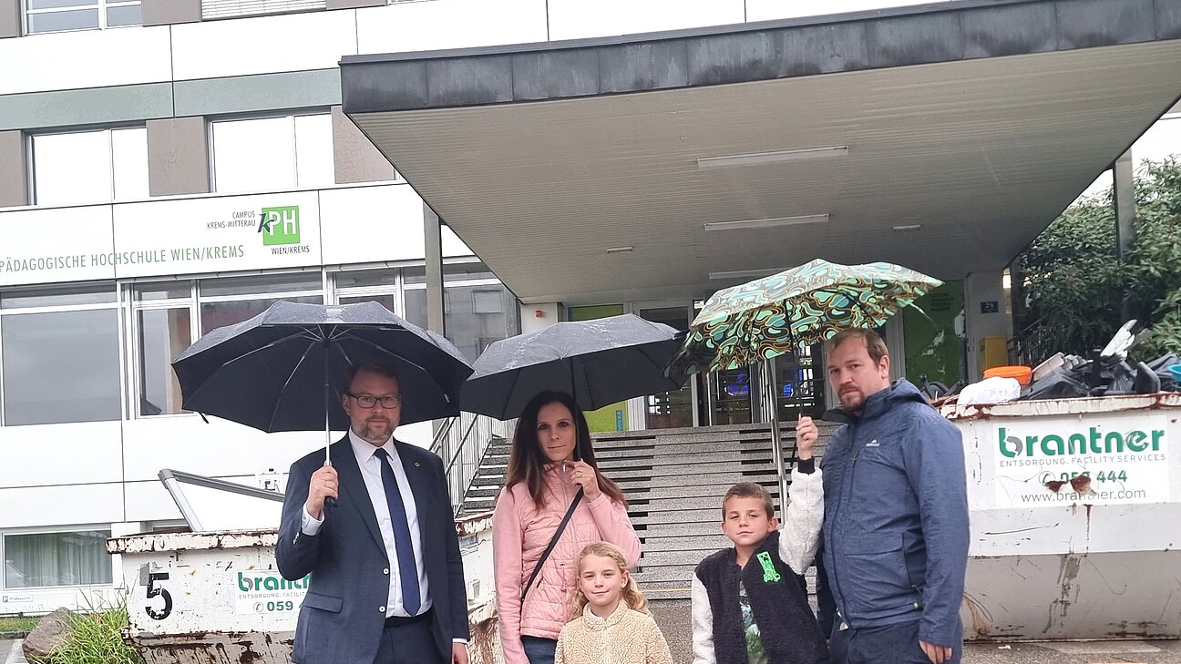 Bildhinweis: Vbgm. Dr. Florian Kamleitner mit der betroffenen Familie Pichler; Mutter Evelyn mit den beiden Schulkindern Laura und Andreas, sowie Ortsparteiobmann Fabian Haider.